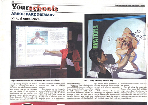 Academic, cultural, and sport achievements continued during this era due to the teacher leadership approach. The team was highly competent, committed, and dedicated. Arbor Park Primary once again was proactive and at the forefront of technology in our area with computer lessons continuing. The Interactive Smartboard project in the classrooms to ensure that the educators could remain relevant with advanced teaching methods, was launched. An Apple iPad project further allowed forward-thinking educators to incorporate it into their teaching and learning. Learners participated in the annual Science Expo competitions, and the Science Quiz competitions. The educators excelled in the cultural field, and the learners had exposure to the Bi Annual Newcastle Eisteddfod, Newcastle Winter Festival, National Choir competitions, the South African Literacy Association Public Speaking, Reading, Writing, and Spelling competitions, as well as the ATKV Public Speaking Competitions, where our learners obtained national awards. South African Literacy Association Public Speaking: Olwethu Ntshakala 4th at National Finals;   Mbaliyamantungwa Khumalo 2nd at National Finals; Zethu Skosana 2nd at National Finals SALA Provincial Reading Competition:  Mandisi Dludla 1st;  Fanele Mabaso 2nd. SALA Provincial Spelling Competition: Mandisi Dludla 3rd. Rouxné van der Colff ATKV National Semi-Final.
