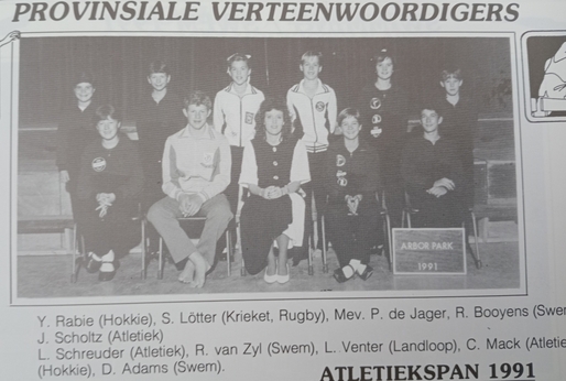 In January 1984, Ms P de Jager, a young educator who would one day become principal, joined the school. With her love for sport, her leadership and coaching, the swimming, athletics, and first hockey team achieved great success. Provincial athletics records were broken.  Many learners obtained provincial colours in all three of these sporting codes.  Zona Boshoff was one of these high-achieving learners and an excellent hurdler, and sprinter, hockey player and swimmer. Ms De Jager continued to organise the annual Arbor Park Winter Sports Day, which remained a huge event on the calendar of local schools. She made a difference in the wider community and represented the school at national level in the managerial and coaching structures of swimming and athletics - and provincially for hockey.